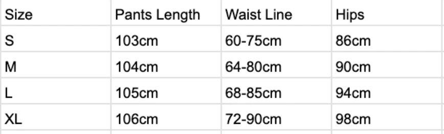 | Size | Pants Length | Waist Line | Hips |